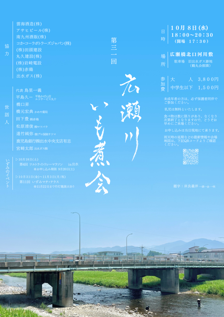第31回広瀬川いも煮会を開催します!(鹿児島県出水市の秋イベント) 出水ガス > イベント・キャンペーン > 第31回広瀬川いも煮会を開催します!(鹿児島県出水市の秋イベント) 今年もやります! 皆様のご参加をお待ちしております♪ 開催日時・・・2025年10月8日(水) 18時~20時30分(開場 17:30)場 所・・・広瀬橋北口河川敷(駐車場 旧出水ガス跡地※鶴丸会館隣)参加費・・・大人3,800円 中学生以下1,500円(乳児は無料) お申し込みは現地で承ります。その他・・・未成年者は必ず保護者同伴でお願いします。/食べ物には数に限りがありますので、お早めにお越しください。雨天の場合は、こちらのほか、SNSやまいぷれなどで延期等のお知らせをいたします。 最新のイベント情報こちらから♪ 最新情報やその他情報も! 2025年10月07日